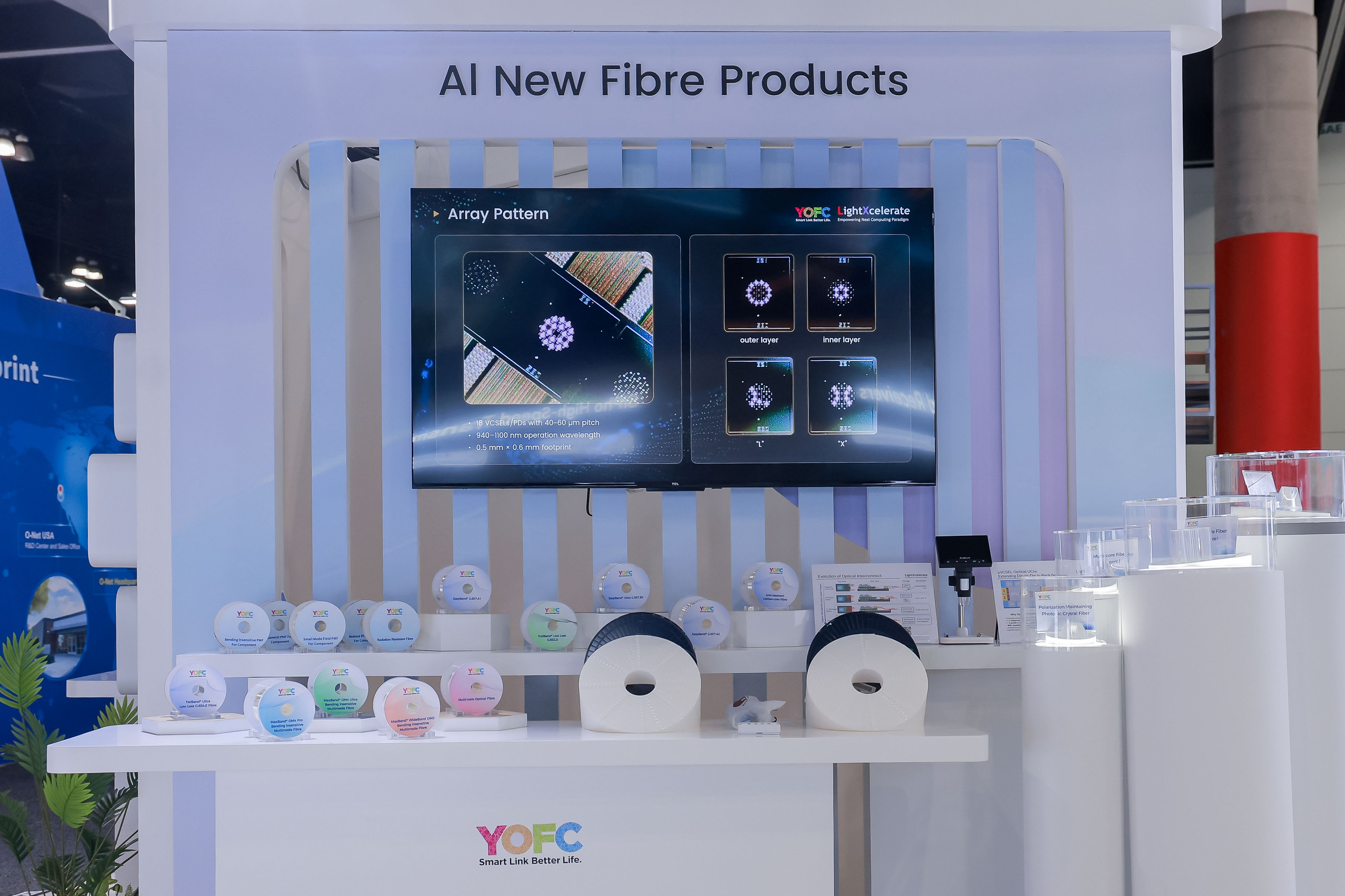 AI新型光纤板块重点展出了面向下一代智算中心与骨干传输的空芯光纤、、多芯光纤、、、、G.654.E光纤及系列高端多模光纤等产品。。博水信息技术人员演示了后处理空芯光纤的防渗水性能和空芯光纤吸收峰测试方法,,,现场展示的单盘91.2km长度和衰减0.04dB/km的空芯光纤吸引客户广泛关注。。。。博水信息与设备商诺基亚、、、EXFO、、、VIAVI联合展示了空芯光纤的测试和传输,,,,致力于促进空芯光纤产业生态的发展。。。此外,,,博水信息公司此次展示的OIO解决方案,,,,基于多芯光纤高密度互联,,展示了多芯光纤与阵列光源的精密耦合,,为OIO光互联提供了新的思路。。。