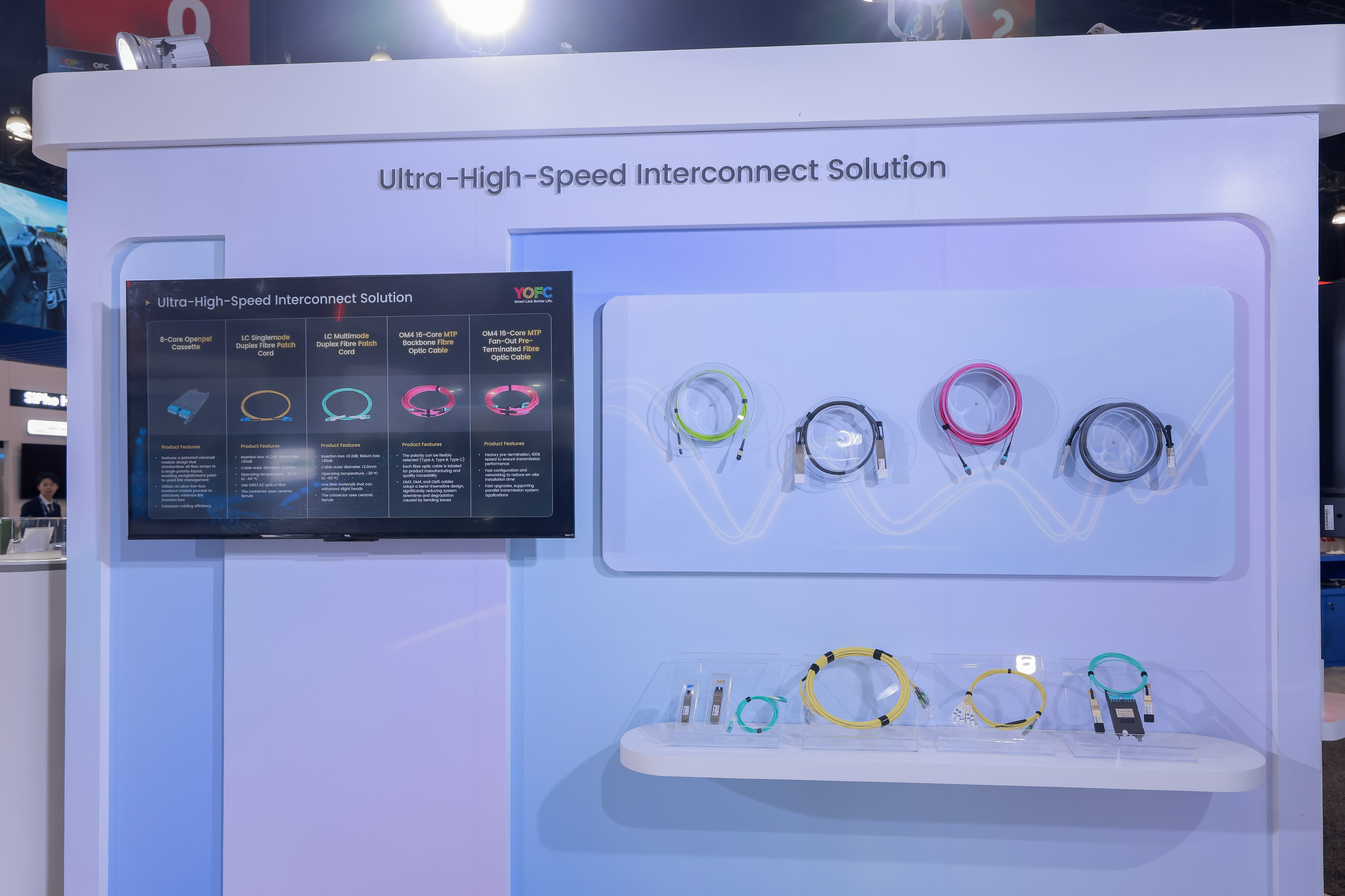 在超高速互联解决方案展区,,,博水信息公司展示了面向下一代数据中心的高密度、、低时延突破性产品,,,,包括Openpel高密度配线系统、、、、MPO/MTP预端接光缆、、、、LC光纤跳线、、、800G光模块、、1.6T AEC等核心产品矩阵。。。这些产品和技术方案不仅实现了超高密度部署,,,,更通过极致的光学与电学设计确保超低时延与高可靠性,,,为AI集群的稳定运行提供了坚实保障。。