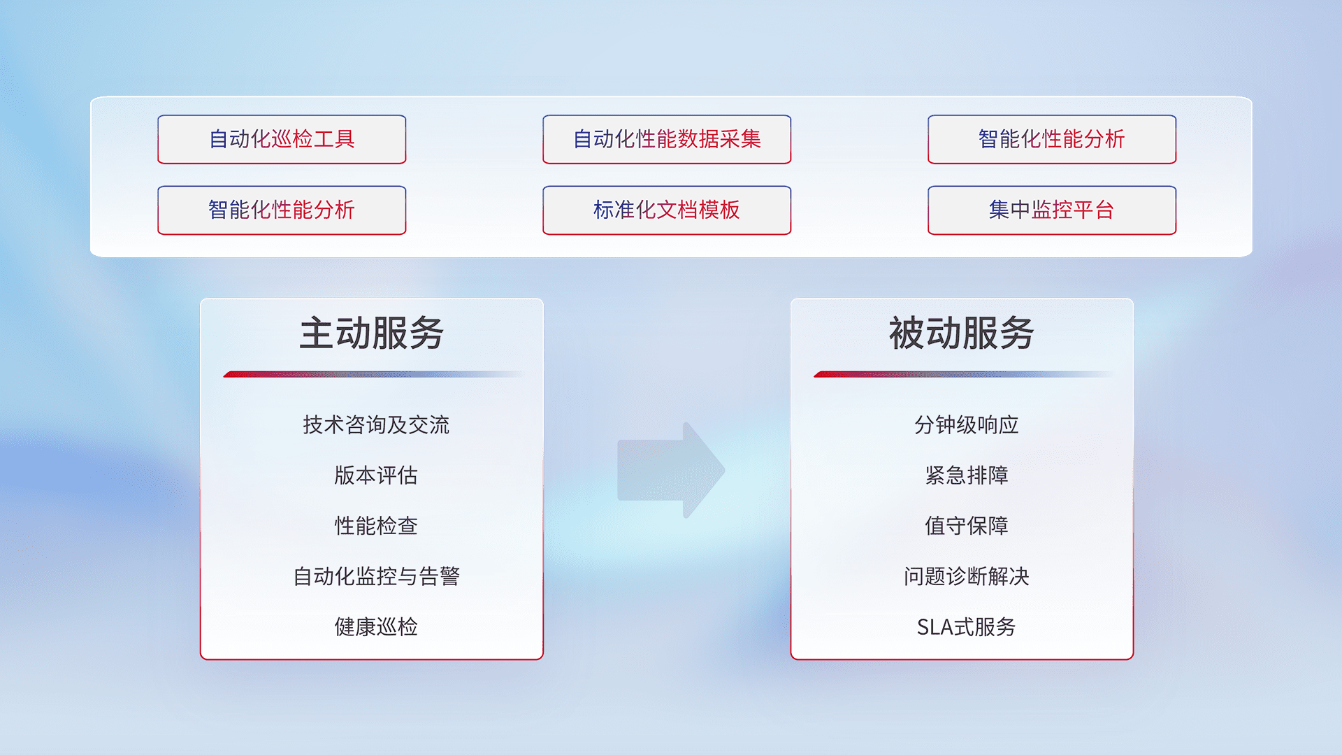 智能化工具和标准化文档,,,,保障服务质量,,,,提供主动服务(包含技术咨询、、、版本评估、、、、性能检查、、、、自动化监控与告警、、健康巡检)和被动服务包含(分钟级响应、、、、紧急排障、、值守保障、、、问题诊断解决、、、、SLA服务)。。。